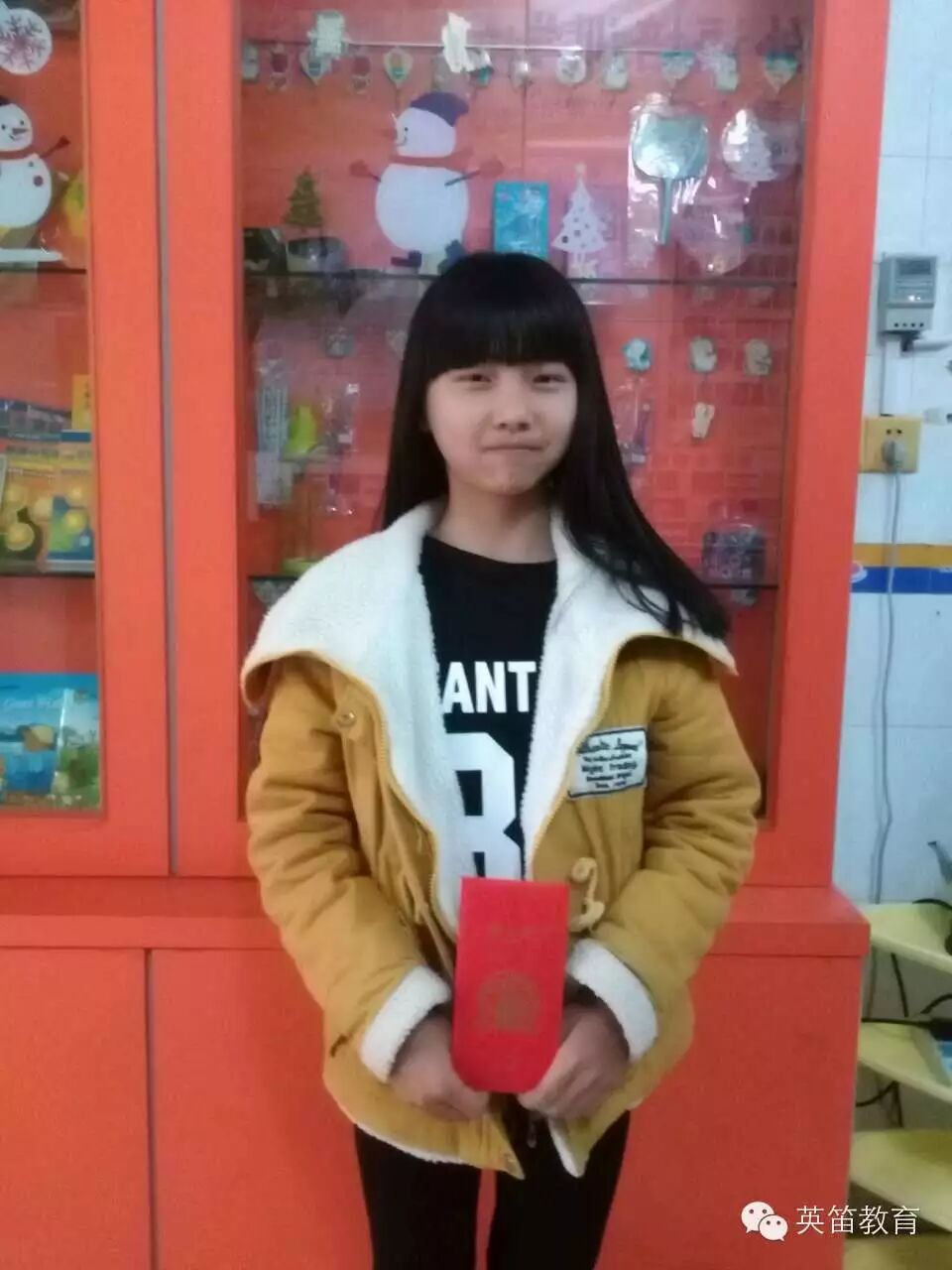 陈芸,莲花中学七年级学生,英笛教育海澄洪恩英语分校学员,在2015-2016年龙海市期末英语考试中,获得班级第一名的好成绩,喜得我校奖学金100元。