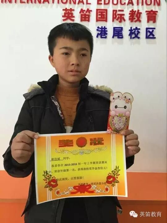 林佳斌,港尾中学七年级学生,英笛教育港尾洪恩英语分校学员,在2015-2016年龙海市期末英语考试中,获得年段第一名的好成绩,喜得我校奖学金300元。