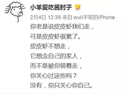 你们这些人,总是说皮皮虾我们走,可是皮皮虾很累了,它不想走,你关心过这些吗?没有,你只关心你自己。