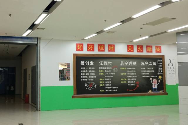 在上海五角场地铁进出口,一则这样的广告吸引了很多人的观众。在川流不息的人群中,一个黑板报“屹然而立”在墙面上,上面写着易付宝、苏宁众筹等信息。