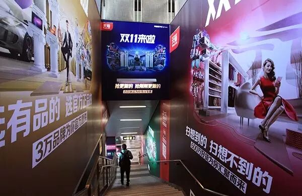 另外,为了配合活动,天猫在接下来的双十一前,在距离京东新总部大楼一步之遥的地铁站里,将“天猫全球狂欢节”画面狂刷整条亦庄线上演十月围城大戏。