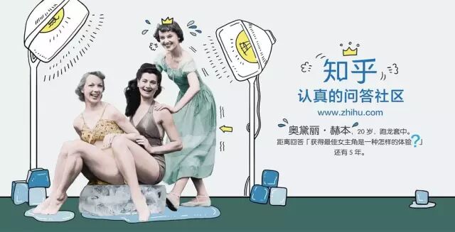 广告图片选用了这些名人从未被媒体曝光过的形象(比如成名前的赫本),文案也采用了经典的知乎风格,比如:奥黛丽赫本,20 岁,跑龙套中。距离回答”获得最佳女主角是一种怎样的体验?”还有 5 年。