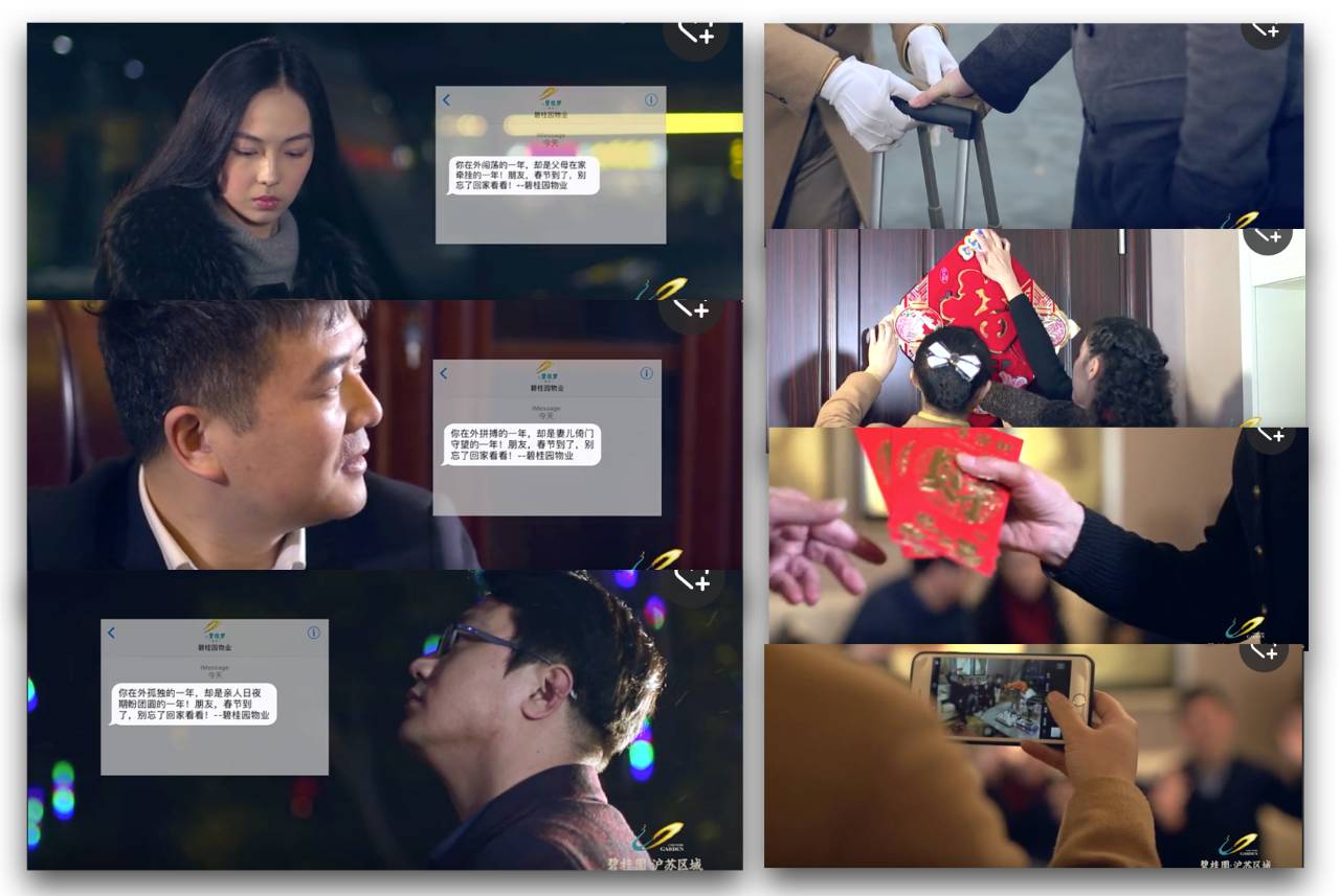 ③ 以物业为线索:三段故事均出现春节时碧桂园物业的短信提醒,以此作为在外和返乡的转折点,融入共鸣,以碧桂园物业为线串起整个故事,并植入物业为业主拍摄照片、发红包、贴春联等服务,让客户对碧桂园物业和产品产生信赖感,激发购买欲望。