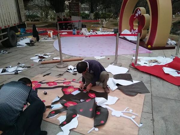 香雪公园门口搭建了舞台,整个舞台以粉色系为主,导游图、消防平面图等指引清晰,为开幕准备。