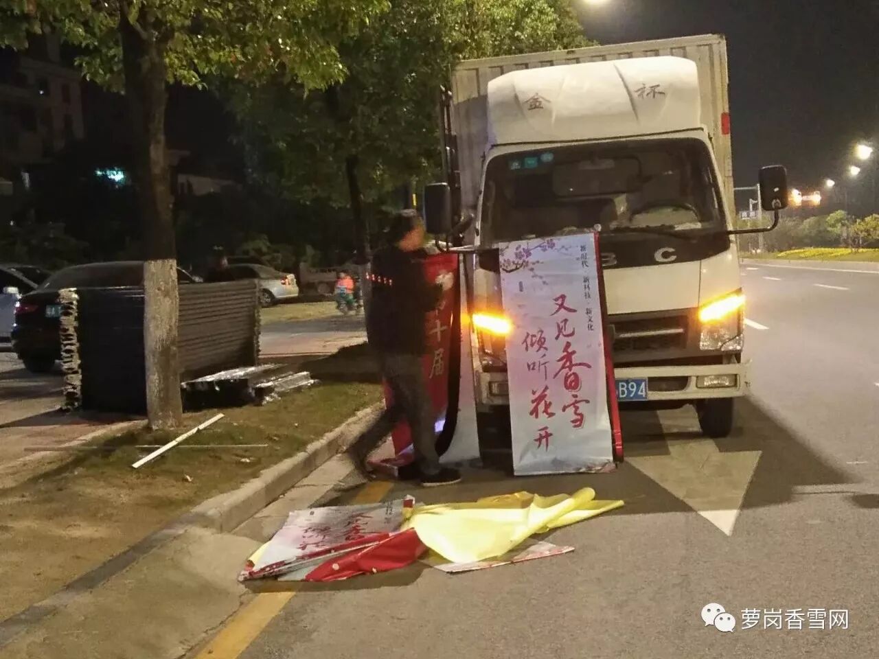 这几晚工人在香雪大道周边加紧安装广告挂牌。