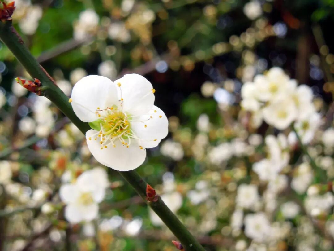 一株、两株、三株……千万株梅花,一夜齐放,清香四溢,玉宇澄清。在这一片白雪皑皑、银装素裹中,花香自开,不是春天胜似春天。梅,其实也是春的使者,十里梅林,花开胜雪,透露出蓬勃浓郁的无边春意。