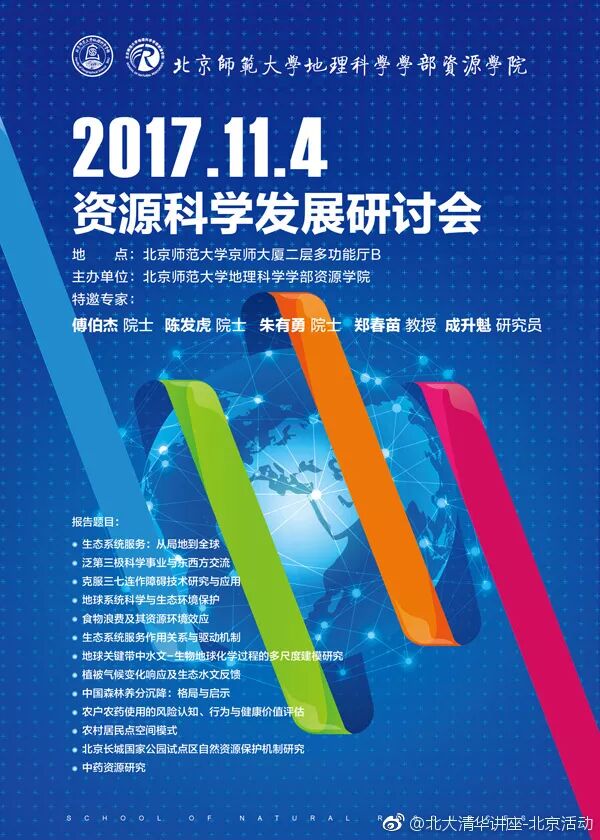 【资源科学发展研讨会】2017年11月4日(周六)【特邀专家】傅伯杰 院士,陈发虎 院士, 朱有勇 院士, 郑春苗 教授, 成升魁 研究员【地点】北京师范大学京师大厦二层多功能厅B