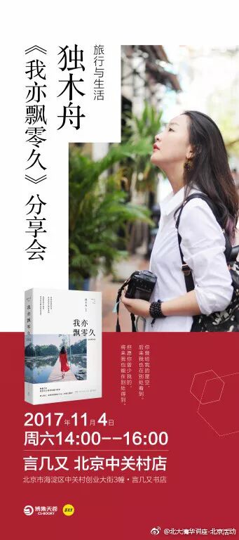 【旅行与生活——独木舟《我亦飘零久》分享会】2017年11月4日(周六)14:00---16:00【嘉宾】独木舟(作家)【备注】参加分享会的读者请先到书店前台领取排队号,活动现场座位有限,先到先得。【地点】言几又(北京中关村店)北京市海淀区中关村创业大街3幢·言几又书店