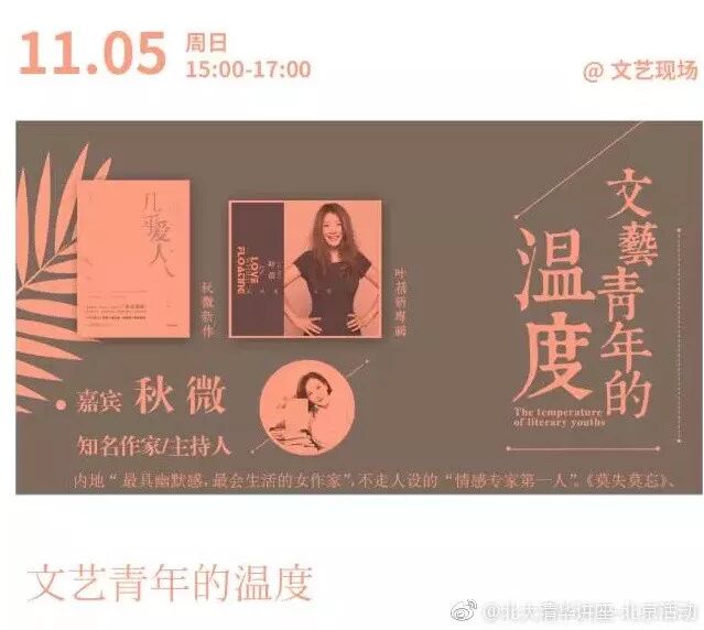 【文艺青年的温度】2017年11月5日(Z后日)15:00 - 17:00【嘉宾】秋微(知名作家、主持人);叶蓓(内地“校园民谣唯一女歌手”)【地点】单向空间·朝阳大悦城店(朝阳区朝阳北路101号朝阳大悦城5楼42室)