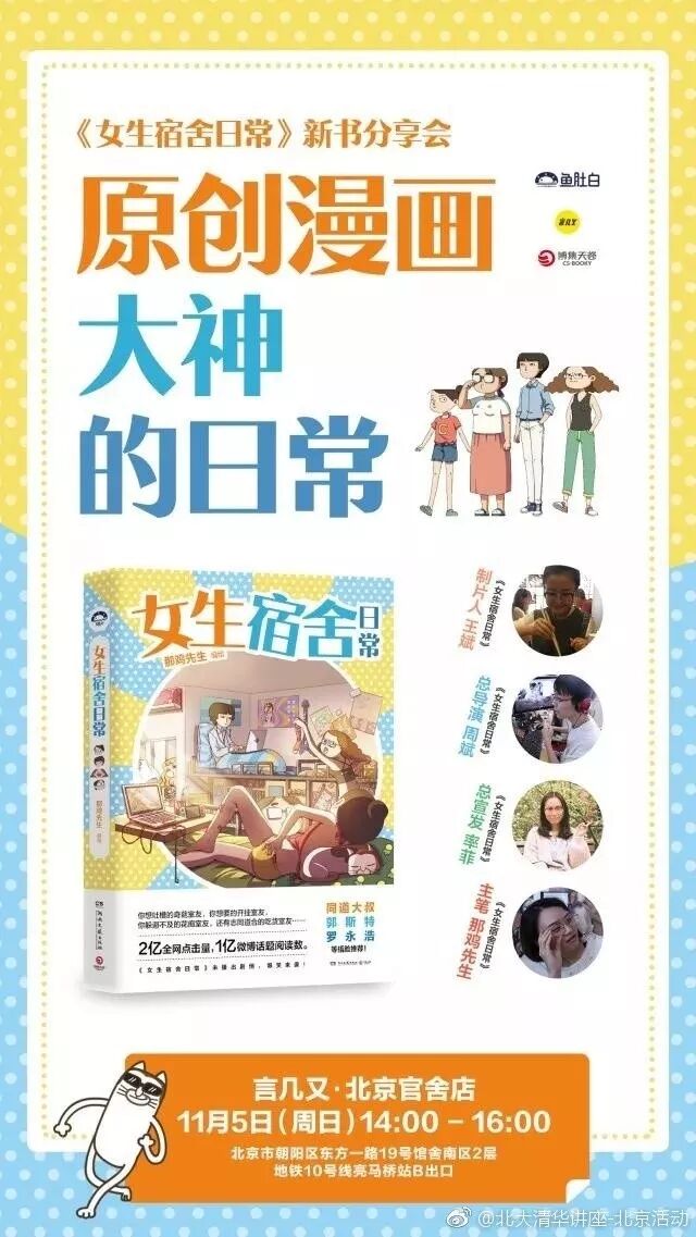 【原创漫画大神的日常——《女生宿舍日常》新书分享会】2017年11月5日(周日)14:00-16:00【嘉宾】王斌(《女生宿舍日常》制片人);率菲(《女生宿舍日常》总宣发);周斌(《女生宿舍日常》总导演);那鸡先生(原名韦彤,《女生宿舍日常》主笔)【简介】《女生宿舍日常》主角原型主创集体亮相,分享原创漫画大神的日常。讲述创作之初的灵感来源,创作过程遇到的趣事,作为故事主人公原型的他们在日常生活中与故事中的人物有那些异同之处。作为二次元大神的他们生活中发生过那些趣事呢?【地点】言几又官舍店(北京市朝阳区东方一路19号馆舍南区2层)