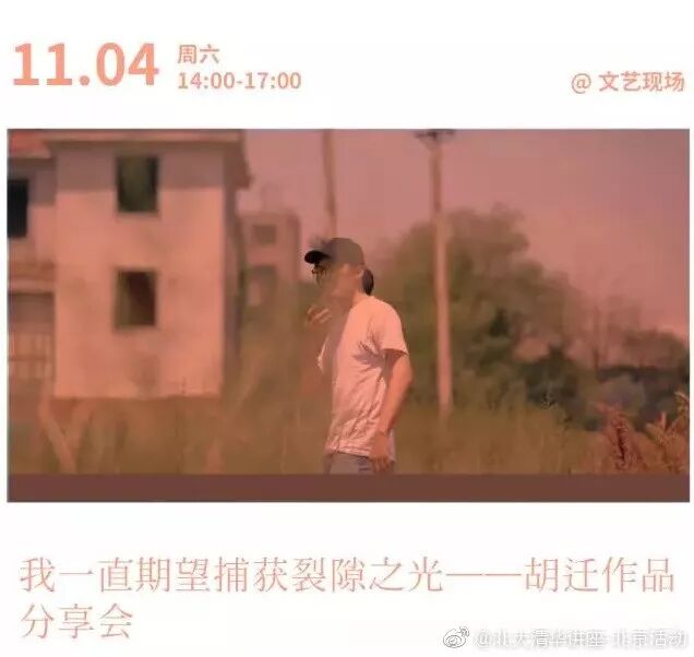 【我一直期望捕获裂隙之光——胡迁作品分享会】2017年11月4日(周六)14:00 - 17:、当代女作家);赵志明(小说家);苗洪;绿妖(媒体从业人员)【简介】这是一次纯粹的作品分享。希望到场的你,读过他的作品,或者至少对他有一点了解。【地点】单向空间单向空间花家地店(北京朝阳望京中环南路1号中国社会科学院研究生院尚8人文创意园D座1层)