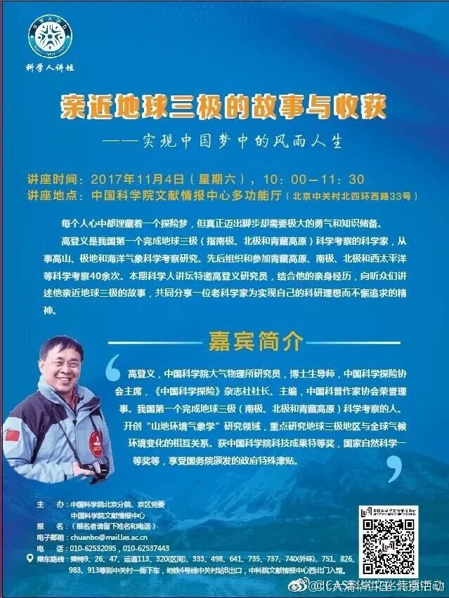 【科学人讲坛:亲近地球三极的故事与收获】2017年11月4日(周六)10:00【主讲】高登义(中国科学院大气物理所研究员,博导)【地点】中国科学院文献情报中心多功能厅