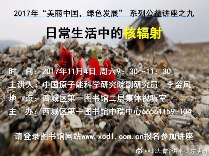 【日常生活中的核辐射】2017年11月4日(周六)9:30 - 11:30【主讲】李金凤(中国原子能科学研究院副研究员)【地点】西城区第一图书馆二层集体视听室【报名链接】http://t.cn/RWItEpW