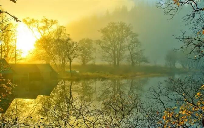 远处的村庄,树木,笼罩在晨曦里,一缕一缕轻柔的雾,在缓慢地游离,一切是那麽的宁静。看,太阳要起床了,羞红了脸,不好意思的,慢腾腾的,在层层云霞的托举下,一点点向树梢上蹿,终于露出了那张灿烂的笑脸,呵呵,又是一个明媚的秋天!