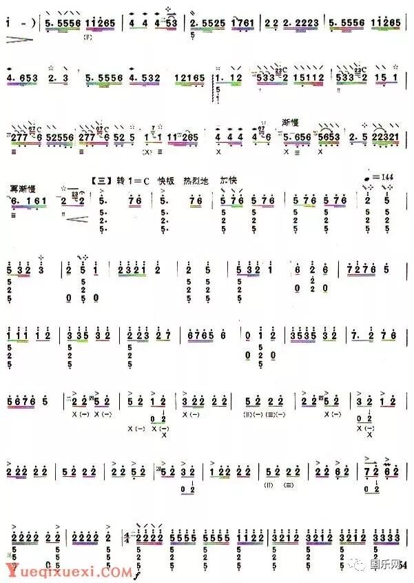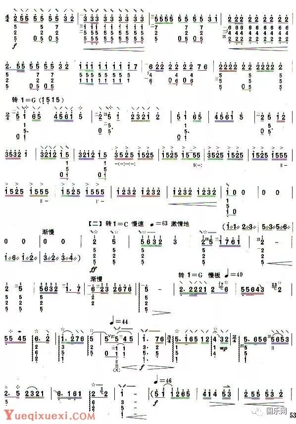 第二部分(慢板)旋律以山东琴书和山东柳琴戏的音调为基础,通过调式调性的变化,以及演奏上推、挽、吟、揉的技巧润饰,与前后两段形成了鲜明的对比,富有韵味。