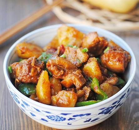 1.鸡洗净,半只煲汤。另半只切块,焯水。土豆去皮,切块