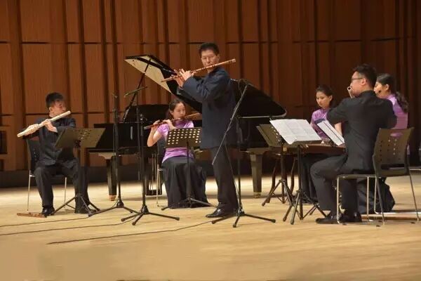 嘴角后收,成微笑状,双唇放松合并,集气流于一束冲开双唇,形成自然的椭圆形,气流向下方,匀速吹进笛孔。