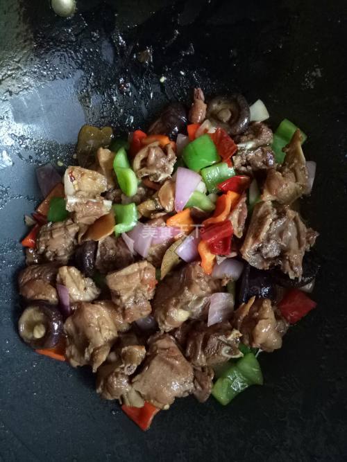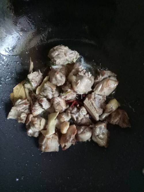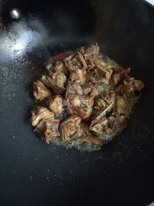 6. 倒入鸭肉不断翻炒,炒出鸭腿里的油