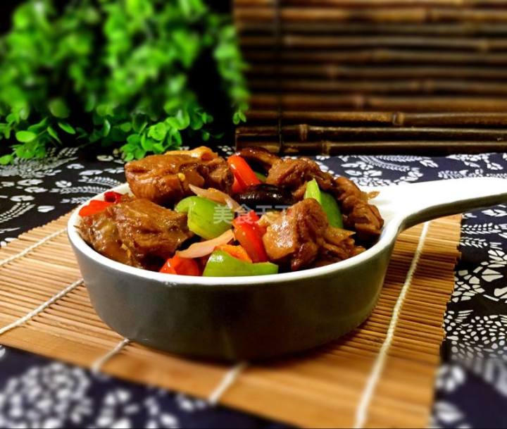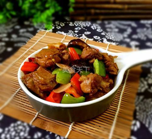鸭腿2个八角1个桂皮2块香叶3-4片青椒半个红椒半个糖1茶匙生抽2茶匙啤酒1罐干红辣椒3个洋葱半个干香菇6-8个醋1茶匙料酒3茶匙盐1小勺鸡精1小勺食用油适量姜3—4片葱2-3根难度普通时间数小时口味微辣工艺蒸