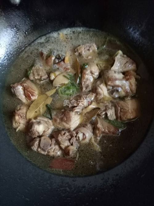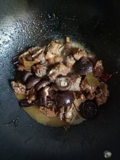 10. 等焖煮至汤汁还有一半时,加入香菇,焖煮至汤汁还有三分之一时,加入盐翻炒几下