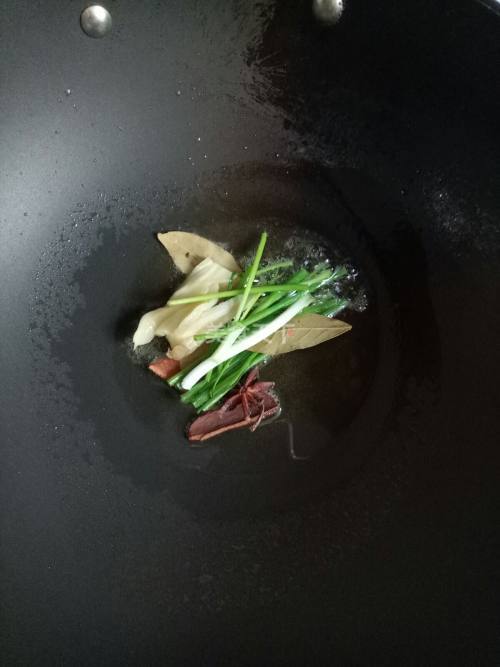 5. 锅里倒入适量的食用油加热,爆香葱、姜、八角桂皮,香叶、干红辣椒