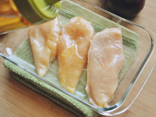 Step1: 鸡胸肉用盐、黑椒、生粉和油腌制,并且稍作按摩帮助入味。(至少30分钟,可以的话最好前一天晚上准备好)