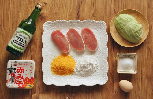 材料:猪扒、鸡蛋1-2个、赤味增1茶匙、清酒1茶匙、清水3茶匙、包心菜、生粉/面粉、面包糠、白糖0.5-1茶匙、盐、黑椒、油
