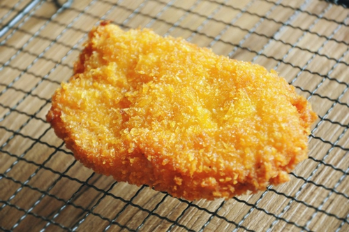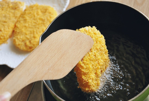 Step3: 加入足量的油,以高火加热,然后调至中小火炸至金黄,大概需要4-5分钟(需要视猪扒的大小自行延长或缩短时间,想更酥脆的朋友可以先每面中火炸一分半钟,拿出来晾凉,然后再加热油,重新大火炸大约1分钟)。