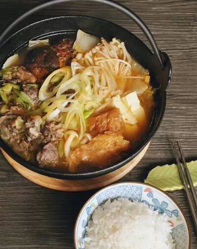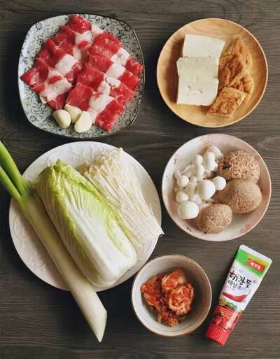 材料:辣白菜半碗、韩国辣酱2-3勺、大葱半条、娃娃菜、肥牛、豆腐、各种菌菇、蒜头几瓣、高汤/水(能刚好没过食材的分量)、面筋,以及其他你喜欢的火锅食材