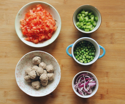 材料:肉丸适量、洋葱1/4个、番茄两个、青豆小半碗、切丁西芹小半碗、牛油一小块、盐、黑椒、蕃茄酱、高汤/水、意大利风味香料(可选)