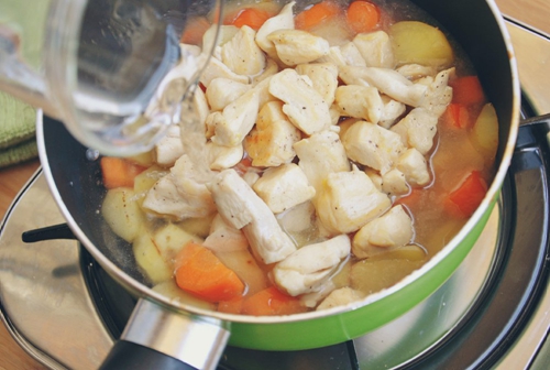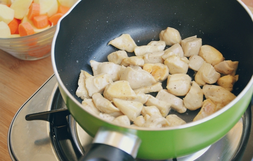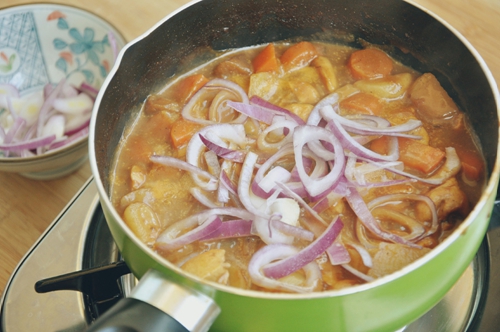 Step3: 锅中再加热点油,炒香洗净后去皮切块的红萝卜和马铃薯,然后倒入鸡胸肉和刚好没过食材的水,还有咖喱块大火熬煮。(泰式咖喱比较刺激,日式咖喱则比较温柔)
