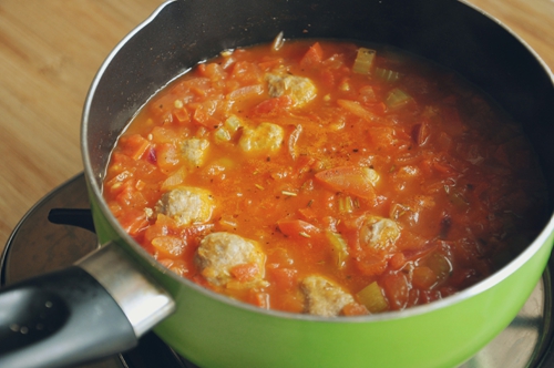 Step3: 沸腾后加入绰过水的肉丸和意大利风味的香料,中小火熬煮到汤汁变浓后加入盐和黑椒调味,最后倒入用清水煮熟并过冷水的青豆即可。