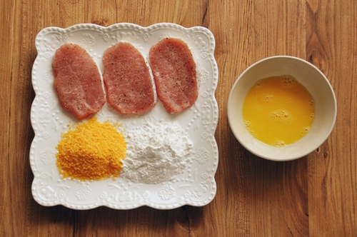 Step2: 松肉完毕后撒上少许盐和黑椒醃制20分钟,接着将入味后的猪扒裹上薄薄一层生粉或面粉,浸入蛋液中,包裹上面包糠,然后再浸一次蛋液裹一次面包糠,略按压,最后轻轻抖掉多馀的面包糠即可放一边备用。