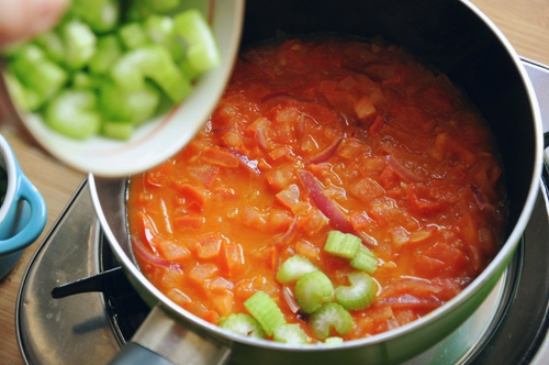 Step2: 加入切碎的番茄丁煮至出汁后倒入西芹粒、高汤/水,以及足量的蕃茄酱。(番茄切碎,而且越碎越好)