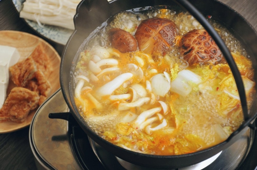 Step2: 锅中倒入高汤或清水,然后放入辣白菜、韩国辣酱、拍扁的蒜瓣,以及除金针菇外的菌菇熬煮,沸腾后转小火继续熬煮大约10分钟。