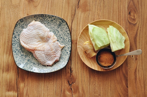 材料:去骨鸡腿肉1-2件、料酒3大勺、红糖2大勺、日式酱油4大勺、蜂蜜1大勺、老抽1大勺、姜、白芝麻、包心菜、清水1/2杯