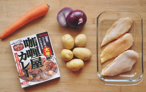材料:鸡胸肉、马铃薯、红萝卜、洋葱、咖喱块