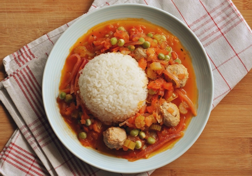 没胃口的时候做这个杂菜肉丸饭吧,新鲜番茄加茄汁,酸甜醒胃,西芹则爽脆富含纤维,如果汤汁多一点,可以做成热辣辣的蔬菜汤泡饭哦!