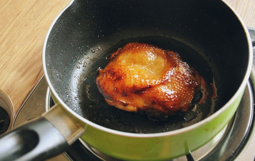 Note:如果你不想熬煮照烧汁,可以直接跳过步骤4,在步骤5的鸡腿肉煎好后淋上步骤3调配好的酱汁,小火熬煮到汤汁浓稠即可。中途要翻动肌肉,以免酱汁煳掉。(千万不要煮到酱汁收干)