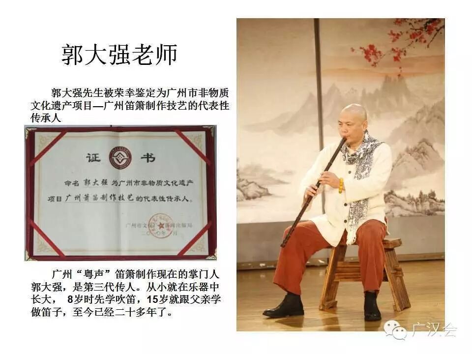 郭大强老师出生于笛箫制作世家,是广州笛箫制作世家的第三代传人。郭大强老师从8岁学吹笛,15岁开始做笛箫,至今已经做学习制作、演奏笛箫二十多年,练就一身手工教音的绝技,人称“南国箫王”。
