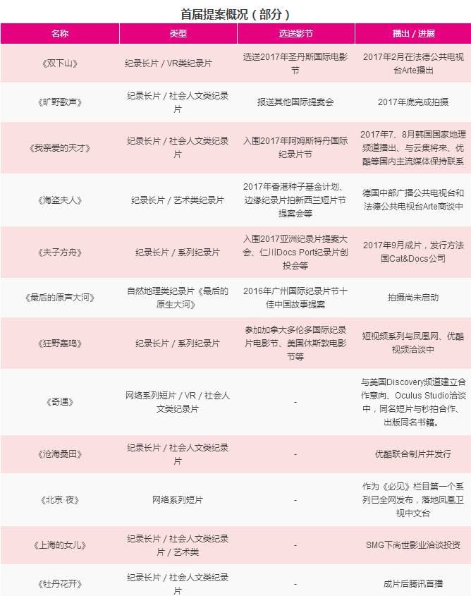 非虚构网络短片、纪实单片、纪实系列片、纪实电影、VR均可。首次参加提案大会的作品,组委会将优先考虑。