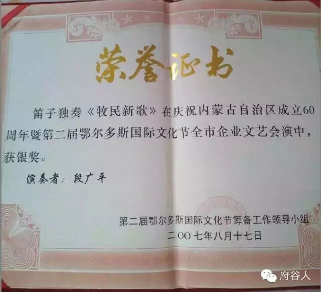 段广平,男,府谷人,现任府谷县文化馆笛子专业演奏员,精通乐器有:笛子、葫芦丝等,每周在二中等学校上专业音乐课。