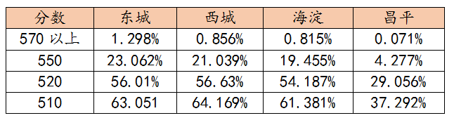 上表可以看出,昌平区高分段处于明显弱势,570分以上不足0.1%,鉴于昌平区目前只有16所高中,且升学压力不大,但是高考是一大关,全北京所有孩子一起PK,昌平区的孩子明显处于弱势,现在能拿得出手的也就是二中的成绩还可以,一中2016年理科一本上线率突破60%,今年未外公布高考成绩。
