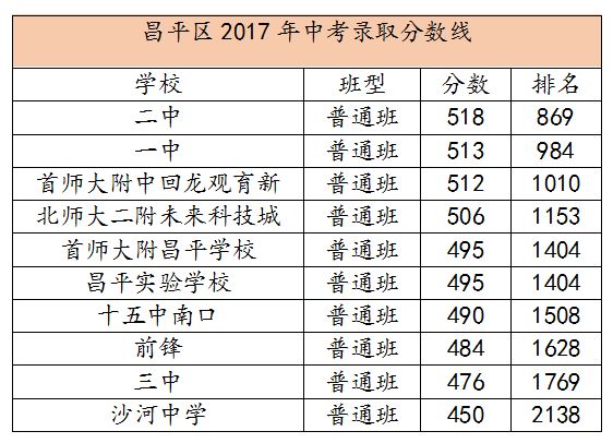 昌平区作为郊区县,整体师资水平稍弱,中考水准也相对较弱,下面是2017年昌平区中考公办校录取分数线。