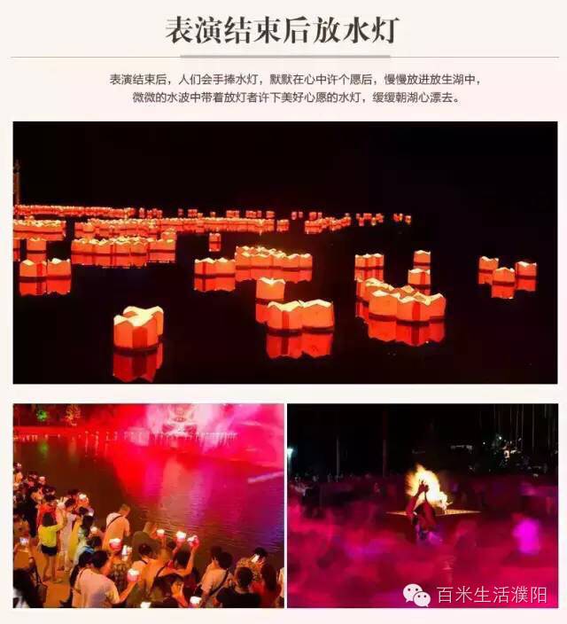 节目结束,每个观众都可领到一盏许愿灯,许过愿后,在漆黑的夜里,来到公园湖边,放入水中,在一个信奉的国度,许下自己心中最美好的愿望,这一场面十分壮观,相信是你此生从未有过的一种感受。