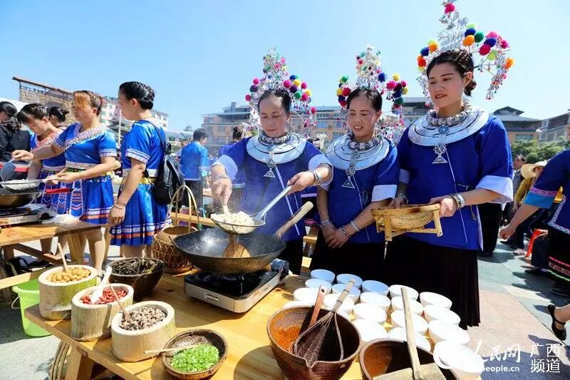 打油茶是侗族特有的一种饮食习惯,其主要原料是“阴米”。接着把配料花生、黄豆、芝麻等炒熟。配料没有规定,时鲜瓜菜、猪肝、虾米都可以放,还可以放些葱花、姜丝等作料。原料准备就绪后就煮茶水。放一把米在锅里炒到焦黄,再添上本地土制的上好茶叶炒拌几下加水煮沸,滤出渣子。把茶水倒进盛着米花等原料的碗里便是油茶。春节期间的油茶还要加两块手指宽的油煎糍粑。花生、时蔬、葱花、糍粑......若将这些滤除的渣子装一盘,应该已经算一道菜了吧?可惜今天未能一见。