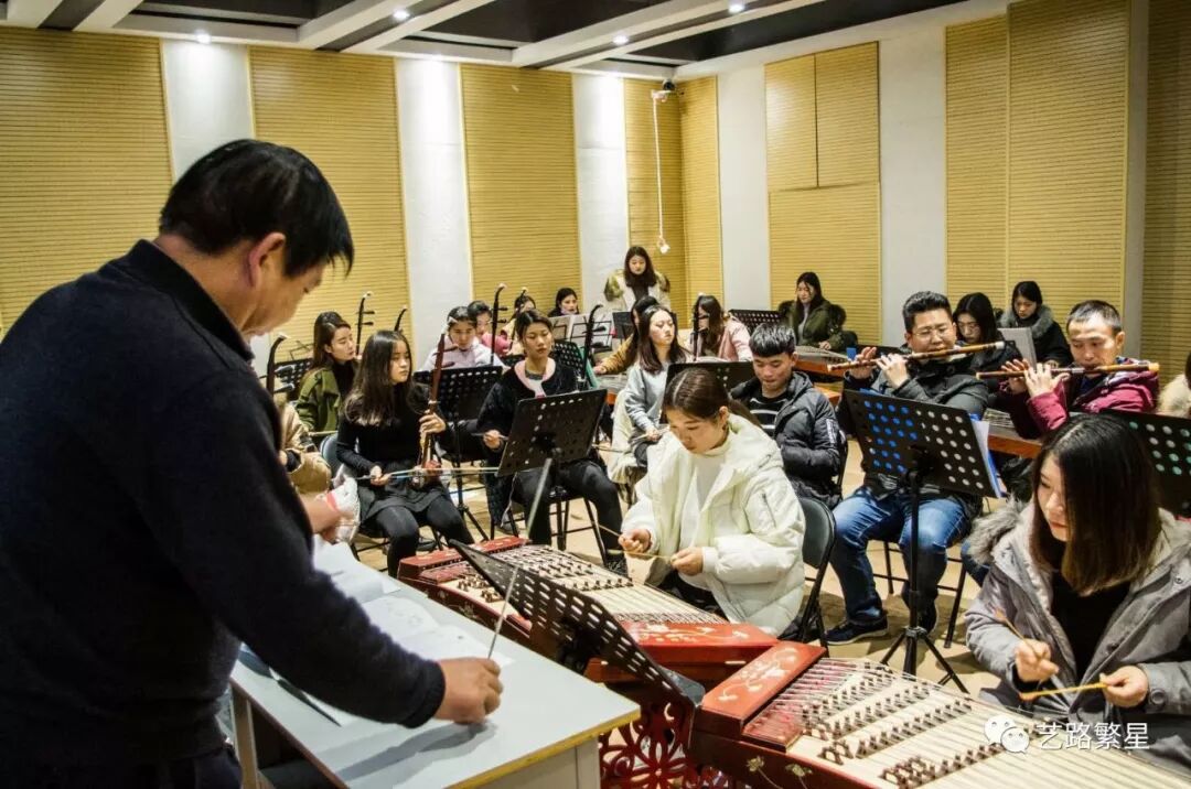 △著名二胡演奏家、艺术学院司松林教授(左一)在指导龙吟国乐团排练