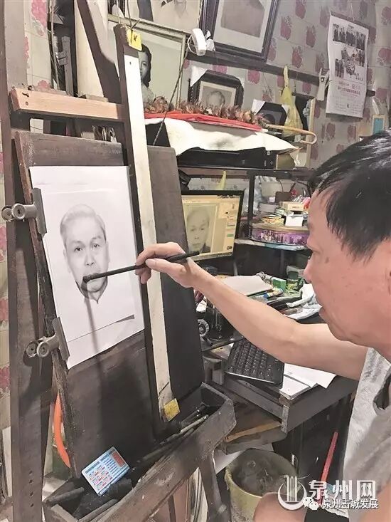 在中山路,有这么一家独特的画室。画室的装修显得很古旧,墙上挂满了人物画像,有一名师傅,正手持毛笔、表情专注、一笔一画地勾勒着纸上人物头像的轮廓。师傅姓胡,是画室的主人。
