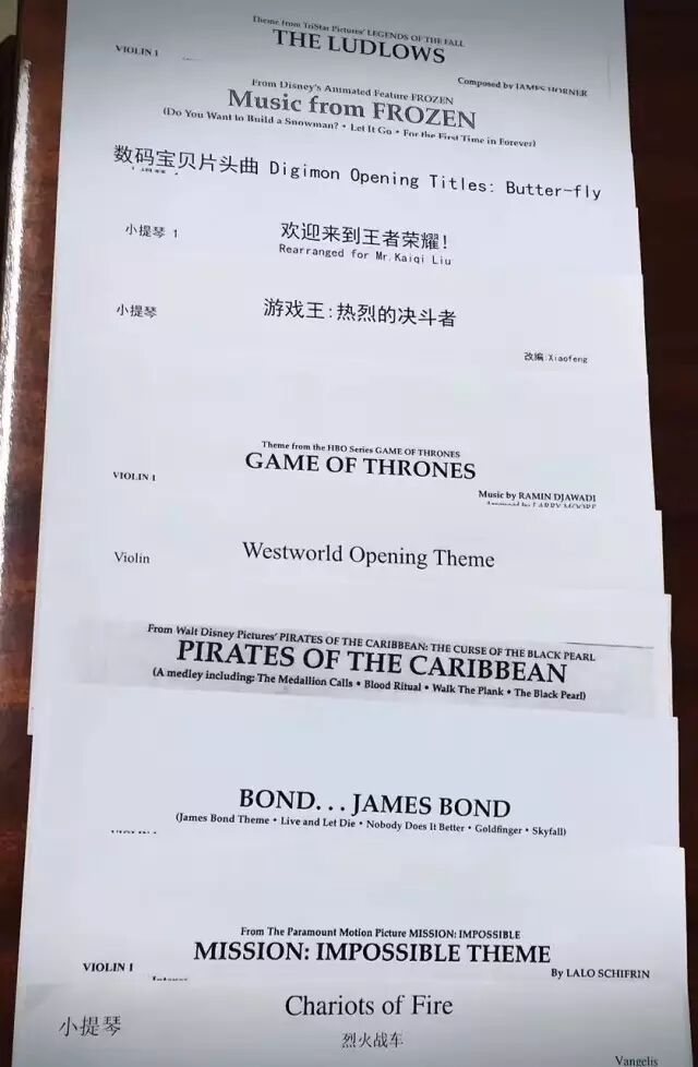 有一套正式出版的弦乐团改编谱,包括《加勒比海盗》组曲、《冰雪奇缘》《The Ludlows》、《权力的游戏》、《碟中谍》和《詹姆斯邦德》,都是耳熟能详令人十分喜爱的旋律,难度也不算很高,我们直接采用了曲谱。此外《City of Stars》、《幽灵公主》西部世界的音乐我们也直接采用了网友的乐谱。