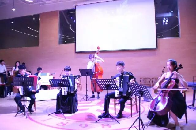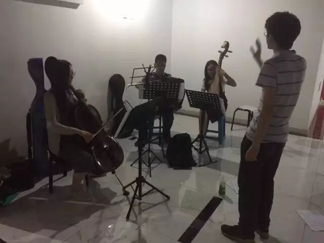 一直帮助我们筹备工作的祁周大神和我一起在手风琴协会专场演出之前赶制了一张易拉宝,说明了我们音乐会的基本情况。当时熬夜很晚,我们俩仔细检查还是没能避免一两个文字错误(后来还被仔细看的观众批判一番)。不料正是这张易拉宝让民乐团长开奇师兄看到,并且举办一场类似的专场恰好也是他多年的心愿,于是他在答辩结束之后也加入了我们。他为我们邀请来了民乐团高水平的bass男神、大提善老师和柳琴小姐姐,使得我们声部瞬间齐全起来,选择曲目的空间也大了很多。